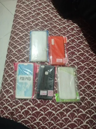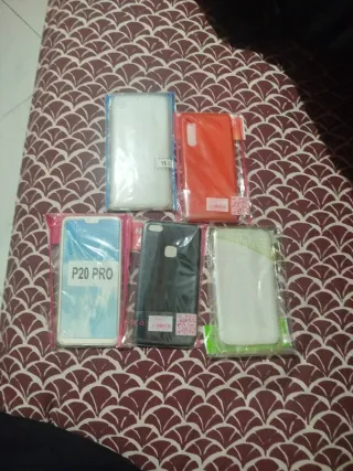Lote de fundas para diferentes modelos de teléfono móvil. Ideales para proteger tu dispositivo con estilo. - Funda blanca con borde azul. - Funda naranja. - Funda azul con texto P20 PRO. - Funda negra. - Funda blanca con borde verde.