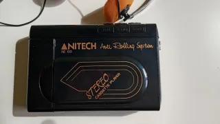 Reproductor de cassette estéreo Anitech AE100 con sistema anti-rebobinado. Incluye auriculares. - Diseño compacto y portátil. - Auriculares con almohadillas naranjas. - Caja original
