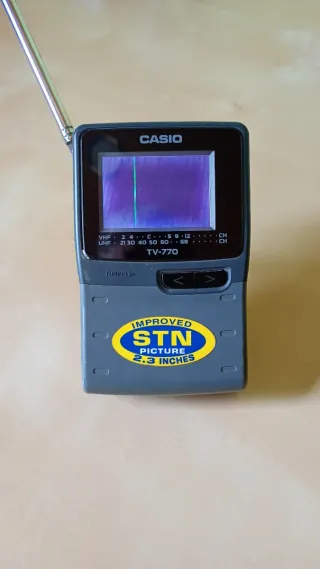 Televisión portátil Casio modelo TV-770 con pantalla de 2.3 pulgadas. - Pantalla STN mejorada. - Antena extensible. - Indicadores de canal VHF y UHF.