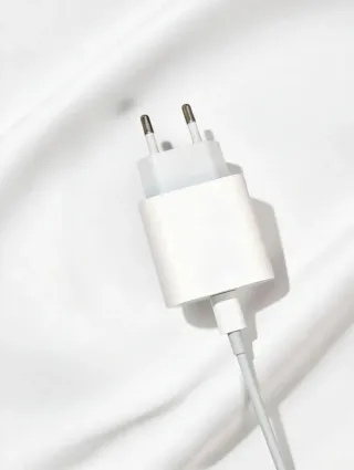 Adaptador de corriente blanco con dos clavijas. Tiene unos desperfectos pequeños como se ven en la foto , pero que no afectan en nada a su funcionamiento . - Diseño compacto y ligero. - Clavijas metálicas.