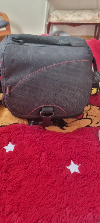 Cámara fotográfica Nikon en color negro, lista para capturar tus mejores momentos. Incluye lente. - Correa para colgar. - Tapa de lente.