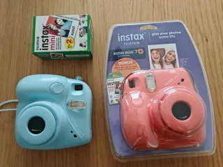Pack de cámaras instantáneas Fujifilm Instax Mini 7+ en colores azul y rosa. La rosa sin desembalar. Incluye un paquete de película instantánea. - Cámara instantánea Fujifilm Instax Mini 7+ (azul) - Cámara instantánea Fujifilm Instax Mini 7+ (rosa) - Paquete de película instantánea Instax Mini (10 exposiciones)