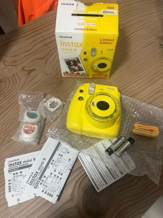 Cámara instantánea Fujifilm Instax Mini 9 en color amarillo. - Incluye accesorios como lentes de colores y correa. - Viene con manuales y baterías.