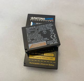 Lote de 5 baterías para cámaras Fujifilm. - 2 Baterías originales Fujifilm NP-W126. - 3 Baterías genéricas Patona NP-W126. - Voltaje: 7.2V. - Una de las Patona es de alta capacidad