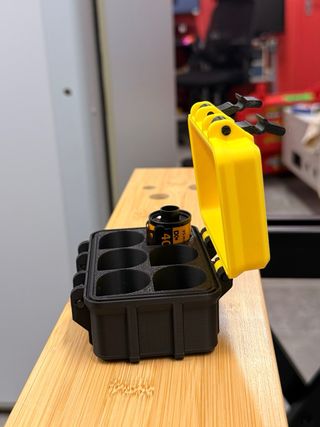 Estuche amarillo y negro para carretes de película fotográfica de 35mm. Realizado con impresión 3d. - Capacidad para 6 carretes de 35mm. - Cierres de seguridad. Varios modelos y varios colores: Nikon, fujifilm, leica, hasselblad... También podemos ampliar el cajetín para capacidad de 12 carretes de 35mm, o de 3 carretes de 120mm, con sus correspondientes soportes y sujeciones. Ambas con un plus de 4 euros, sease 12 euros.