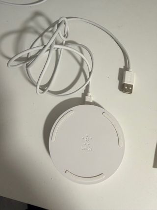 Cargador inalámbrico Belkin con tecnología MagSafe para iPhone. Su diseño circular y blanco se adapta a cualquier espacio. - Base de carga redonda. - Cable USB blanco incluido. - Patas antideslizantes en la base.