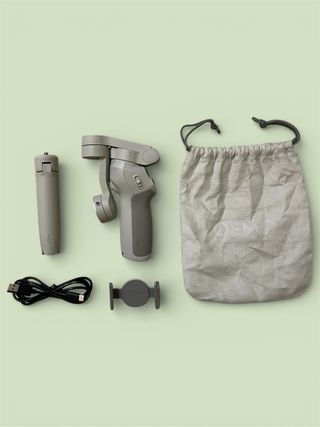 Gimbal DJI Osmo Mobile 3 Combo. Se enciende pero hay una pieza suelta y hay que repararlo, por eso su precio. - Incluye bolsa de transporte. - Cable USB. - Mini trípode.