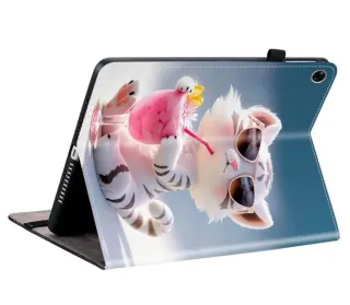 Funda protectora para tablet con un diseño divertido de gatito con gafas de sol y un batido. - Estampado a todo color. - Cierre elástico.