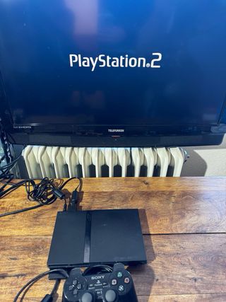 Consola PlayStation 2 Slim en color negro, lista para jugar. Incluye todos los cables necesarios y un mando. - Mando DualShock 2. - Cable de alimentación. - Cable AV.