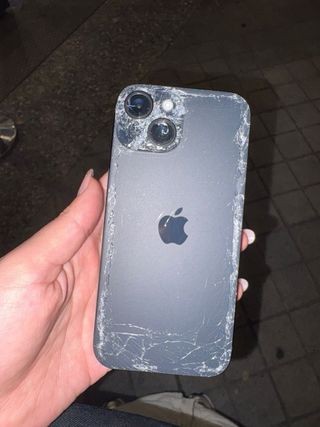 Teléfono móvil iPhone 15 en color gris. La pantalla de alante esta perfecta sin roturas ni rallada La parte trasera presentan daños como se pueden ver en la foto abria que cambiar la parte de atras el movil va perfecto no afecta a su rendimiento nada. Salud de bateria 93 Comprado nuevo a estrenar en julio de 2025 no tiene apenas uso Negociable - Carcasa trasera rota. - Sistema de doble cámara.