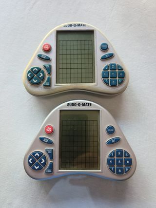 Juego electrónico portátil Sudo-Q-Mate para resolver Sudokus. Ideal para llevar a cualquier parte. Sudo-Q-Mate es un dispositivo de juego electrónico portátil (handheld) lanzado alrededor de 2006, diseñado para jugar al Sudoku sin necesidad de lápiz y papel. Ofrece más de un millón de rompecabezas, diferentes niveles de dificultad y funciona con 2 pilas AAA, ideal para entrenar la mente en cualquier lugar Dos unidades, una como nueva y otra con evidente señales de uso. El precio es por los dos. - Pantalla LCD. - Botones de navegación y numéricos.