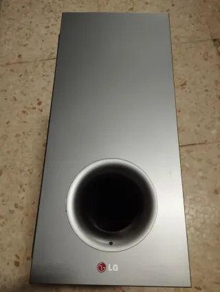 Subwoofer LG con un diseño moderno y elegante. - Color plateado con detalles en negro. - Puerto bass reflex circular.