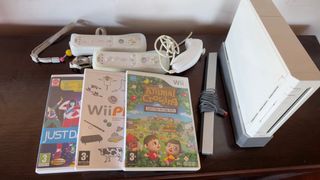 Consola Wii en color blanco, ideal para disfrutar en familia. - Incluye dos mandos. - Juegos: Just Dance y Animal Crossing: Let's Go to the City.