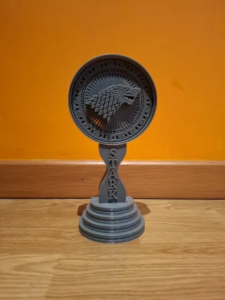 Soporte para auriculares de juego de tronos. - Base escalonada. - Soporte central con forma de reloj de arena. - Detalle del lobo de la casa Stark en la parte superior.