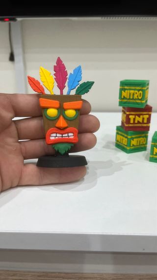Conjunto de cajas temáticas de Crash Bandicoot. Incluye 2 cajas 30x30x30 y la figura akuaku pintada a mano - Diseño inspirado en el videojuego. - Ideal para coleccionistas.