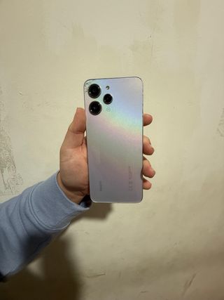 Teléfono móvil Xiaomi con un diseño llamativo y moderno. - Acabado iridiscente que cambia de color. - Configuración de triple cámara trasera - Tiene una pequeña grieta atrás