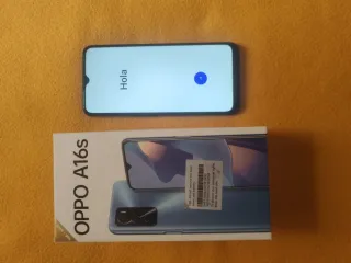 Teléfono móvil OPPO A16s en color azul y con 64GB de almacenamiento. - Pantalla con Hola y un círculo azul. - Caja del producto incluida.