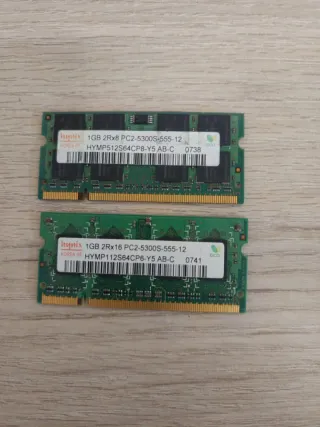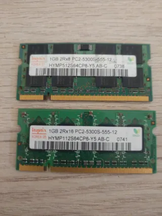 Dos módulos de memoria RAM Hynix de 1GB cada uno. - Capacidad total: 2GB (2x 1GB). - Tipo de memoria: DDR2. - Velocidad: PC2-5300S. - Modelo superior: HYMP512S64CP8-Y5 AB-C. - Modelo inferior: HYMP112S64CP6-Y5 AB-C.