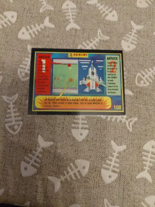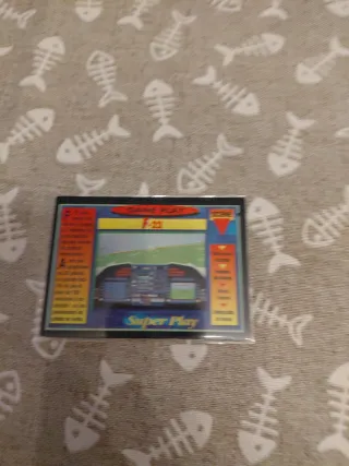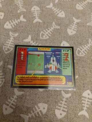 Carta coleccionable de Panini número 108. - Incluye consejos y trucos para misiones. - Ilustración de un caza F-22.
