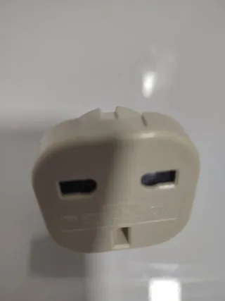 Adaptador de corriente de color beige. - Diseño compacto y portátil. - Entrada para diferentes tipos de enchufes.