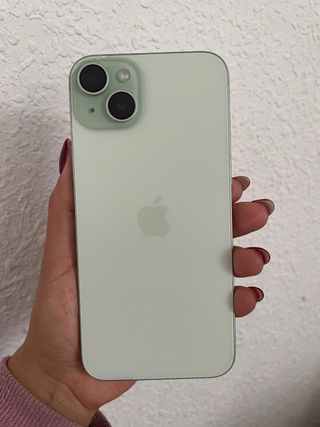iPhone 15 Plus de 128 GB en color verde menta. Funciona perfectamente, nunca reparado. Batería al 86%. Incluye caja original. Tiene un pequeño golpe en la esquina izquierda (visible en fotos), solo estético. Siempre usado con funda. Entrega en mano en Madrid.