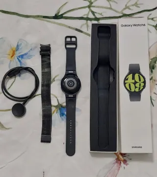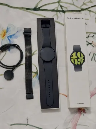 Reloj inteligente Samsung Galaxy Watch 6 en color negro. Incluye cargador y correa adicional. Solo usado un mes. - Correa de malla metálica. - Correa de silicona. - Cable de carga magnético.