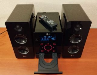 Minicadena LG en color negro. Incluye dos altavoces y mando a distancia. - Diseño moderno y elegante. - Altavoces de alta fidelidad. - Mando a distancia incluido.