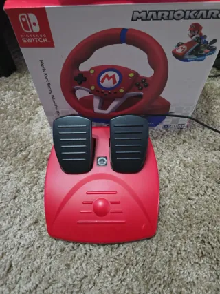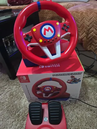 Volante de carreras para Nintendo Switch y PC, inspirado en Mario Kart. Ideal para una experiencia de juego inmersiva. - Diseño ergonómico en color rojo. - Incluye pedales. - Compatible con Nintendo Switch y PC.