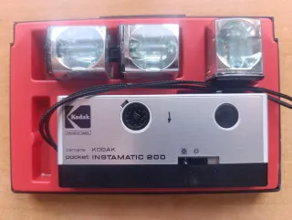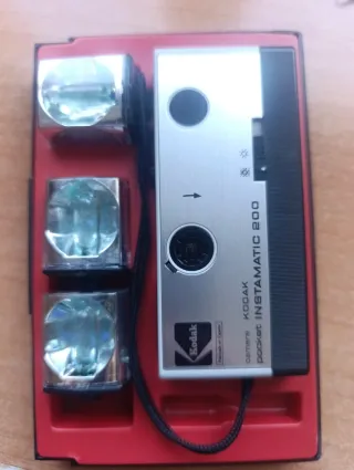 Cámara Kodak Pocket Instamatic 200 en color plata y rojo, con tres Magicubes (flashes). - Incluye tres Magicubes. - Diseño compacto y portátil.