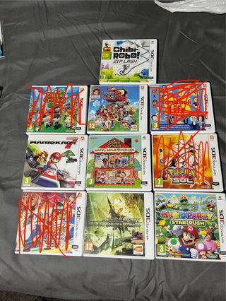 Colección de nueve videojuegos para Nintendo 3DS. SE PUEDEN COMPRAR POR SEPARADO - Animal Crossing. VENDIDO - Mario Kart 7 - Tomodachi Life. VENDIDO - Chibi-Robo! Zip Lash - Inazuma Eleven GO. VENDIDO - Happy Home Designer - Pokémon Sol. VENDIDO - Ace Combat 3D - Mario Party Star Rush