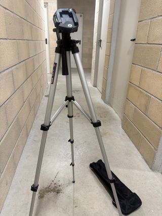 Trípode plateado para cámara fotográfica o de vídeo. Es ligero y fácil de transportar. - Patas extensibles con cierres de clip. - Cabezal giratorio. - Incluye bolsa de transporte negra.