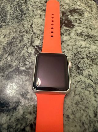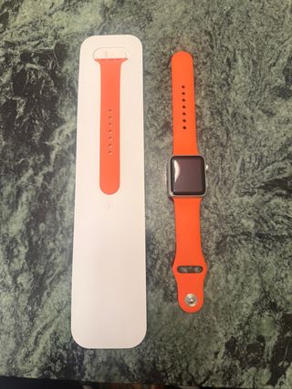 Reloj inteligente Apple Watch de la serie 7000 con correa naranja. 38 mm. - Correa de silicona naranja. - Caja de plata. Incluye cargador y otra correa de color morado.