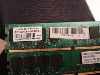 Dos módulos de memoria RAM DDR2 de 1GB cada uno. - Marca: Transcend - Modelo: DDR2 667 DIMM 5-5-5 - Capacidad: 1GB por módulo - Tipo: PC2-5300