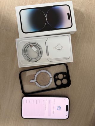 Teléfono móvil iPhone 14 Pro. - Incluye cable de carga USB-C. - Incluye herramienta para SIM. - Incluye funda protectora transparente con MagSafe. Funciona perfectamente, simpre con funda y protector de pantalla. Alguna marca de uso normal. Sin caidas ni nada roto. Salud bateira 82%. Incluido caja original, 4 fundas y protector de pantalla puesto .