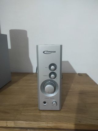 Amplificador de sonido de la marca Typhoon. - Diseño compacto y elegante. - Controles de volumen y tono. - Conexión para auriculares. = Altavoces más Grandes = Subwoofer más Grande = Con todos los Cables