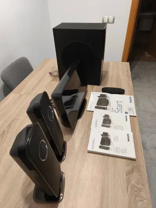Sistema de sonido envolvente Philips para tu hogar. Incluye cuatro altavoces satélite, un altavoz central y un subwoofer. - Diseño elegante en color negro. - Ideal para crear una experiencia de cine en casa. -reproductor de blu-ray y DVD Philips 3000 series. El reproductor creo que no funciona. Negociable. Sin cables.