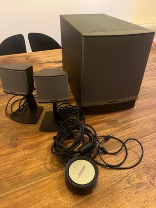 Sistema de altavoces Bose Companion 3 Series II. ideal para ordenador, escritorio u oficina. Incluye: • Subwoofer BOSE • 2 altavoces satélite con soportes • Control Pod original BOSE • Todos los cables originales 🔊 Sonido potente y de alta calidad, especialmente buenos graves (típico BOSE). 🔌 Conexión por cable (jack), compatible con ordenador, portátil, etc. 📌 Estado: Funciona correctamente. Estéticamente usado, con marcas normales de uso (ver fotos), pero 100 % operativo. 📦 Se vende el set completo, tal como se ve en las imágenes.