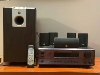 Sistema de cine en casa con altavoces y receptor. Onkyo TX-DS494: amplificar el sonido de diversas fuentes y distribuirlo a un conjunto de altavoces para crear una experiencia de audio inmersiva. Amplifica el sonido: Aumenta la potencia de las señales de audio para que puedan ser reproducidas a través de altavoces, ofreciendo 55 vatios por 5 canales. Decodificación de sonido envolvente: Procesa formatos de audio multicanal como Dolby Digital, DTS y Dolby Pro Logic II. Subwoofer JBL SUB 138 (el cable de red está empalmado como se ve en la foto) 5 altavoces JBL SCS138 Todo el conjunto 110 € Subwoofer: 60 € Altavoces: 30 €