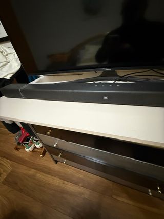 Barra de sonido JBL en color negro. Ideal para mejorar la experiencia de audio. - Diseño elegante y moderno. - Compacta y fácil de ubicar. Usada Dos veces, comprada hace unos meses en la tienda JBL. Preciosa y suena muy bien. He cambiado la distribución de casa y el tele y voy a cambiar de configuración de sonido