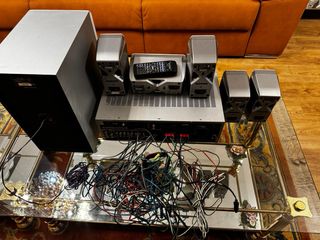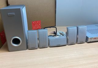 Sistema de cine en casa Kenwood en color gris plata. Está en buen estado y listo para usarse. Incluye un subwoofer y cinco altavoces. Perfecto para disfrutar de tus películas y música favoritas. Incluye mando a distancia.