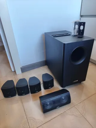 Sistema de sonido para cine en casa. - Altavoces frontales - Altavoces traseros - Altavoz central - Subwoofer - Amplificador/Reproductor Ubicación Benidorm, no se hacen envíos.
