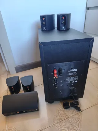 Altavoces Canton Movie CX60 5.1 en muy buen estado, color negro. Sonido potente y equilibrado, ideal para cine en casa. Incluye: Subwoofer activo Canton 4 altavoces satélite Altavoz central 3 soportes originales (2 para satélites + 1 para el central) Todo funciona perfectamente, sin golpes ni daños. No incluye cableado de altavoces. Ideal para salas pequeñas y medianas. Calidad alemana reconocida. Tags denon marantz Kenwood aiwa Pioneer onkyo sanyo Panasonic home cinema b&w focal kef sonus Faber whaferdale