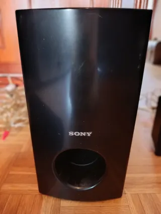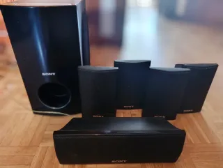 Equipo de sonido envolvente Sony 5.1 en buen estado. Incluye subwoofer, dos altavoces frontales, dos altavoces traseros y un altavoz central. Se incluyen también las bases para los altavoces. Perfecto para disfrutar de una experiencia de cine en casa. - Sistema de sonido envolvente 5.1 - Subwoofer incluido - Altavoces en perfecto estado - Incluye bases