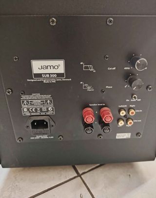 Subwoofer de la marca Jamo. - Diseño elegante en color marrón y negro. - Puerto circular en la parte superior.
