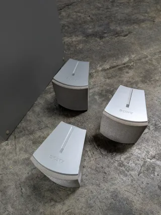 Sistema de sonido para cine en casa de la marca Sony. El conjunto incluye una unidad principal y tres altavoces satélite. - Unidad principal plateada con diseño alargado. - Tres altavoces satélite compactos. - Cables de conexión incluidos.