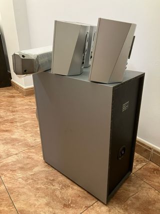 Sistema de altavoces para cine en casa. - Incluye barra de sonido. - Subwoofer. - Cuatro altavoces satélite.