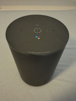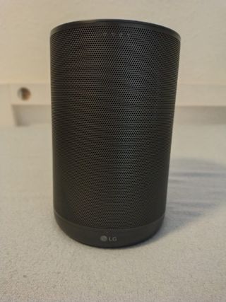 Altavoz inteligente LG en color gris. Diseñado con tecnología Meridian. - Botón de función 'F'. - Controles de volumen +/-. - Indicador de Google Assistant. Tal como esta en la imagen, funciona en perfectas condiciones