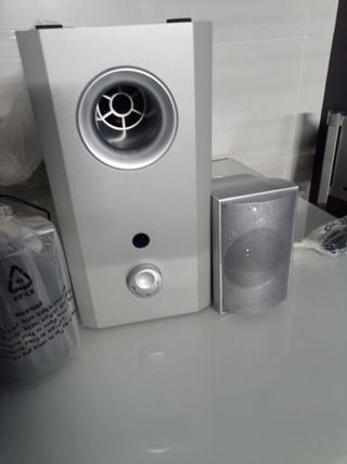 Conjunto de cinco altavoces LG en color gris. Ideales para complementar tu sistema de sonido. Las fotos muestran un conjunto de altavoces LG modelo FE-3620TE, típicos de sistemas de cine en casa o equipos Hi- Fi. Son altavoces pasivos con impedancia de 82 y potencia máxima de 70W. - Diseño compacto y moderno. - Acabado texturizado. - Logo de la marca visible en la parte frontal. 5 unidades Aparentemente buen estado Uno de ellos está cascado como se ve en la foto altavoces Ig, altavoces home cinema, altavoces 5.1, altavoces pasivos, altavoces hifi, altavoces sonido, altavoces cine en casa, altavoces estéreo, altavoces surround,