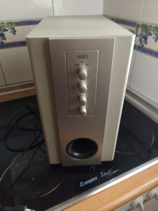 Subwoofer Airis en color beige y plata. Está en buen estado. - Medidas: 30 cm de alto (aprox.) - Incluye un subwoofer.