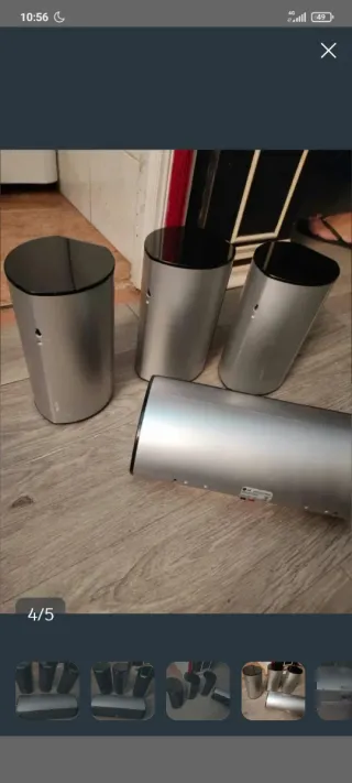 Altavoces de alta gama con un diseño icónico. - Acabado plateado y negro. - Forma cilíndrica distintiva. - Altavoz activo (con amplificadores incorporados).